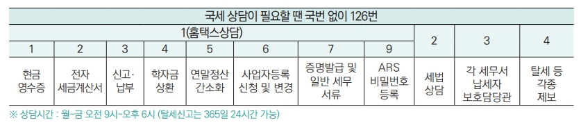 홈택스 이용 및 세법령 관련 사항은 국세상담센터 ☎126 에서 친절하게 도와드립니다.