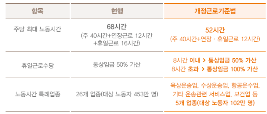 기존에는 평일 40시간 +평일 연장 12시간+휴일 근로 16시간에서 주 40시간+연장 및 휴일 근로 12시간으로 규정하여 16시간의 노동시간을 줄인 것입니다.