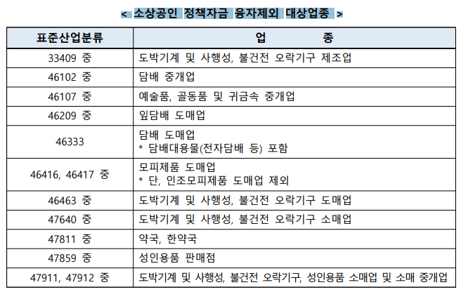 지원대상(①소상공인, ②폐업일, ③영업기간)에 해당되더라도, 소상공인정책자금 융자제외 대상업종은 지원에서 제외됩니다.