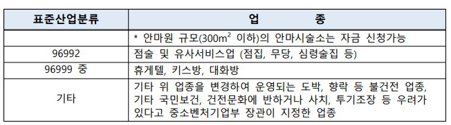 * 운수사업자(개인택시, 개인화물자동차), 유흥주점, 콜라텍 지원가능