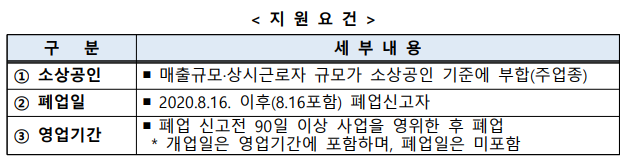 2020.8.16. 이후(8.16포함) 폐업 신고한 소상공인 중 아래 요건을 모두 충족하는 폐업점포 대상입니다.