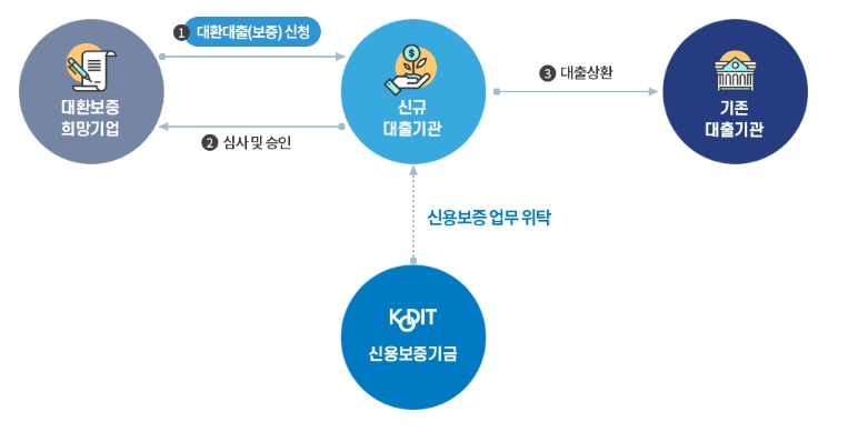 대환 프로그램은 위탁보증 방식에 따라 대환대출과 대환보증을 신규 대출기관에서 함께 취급합니다.