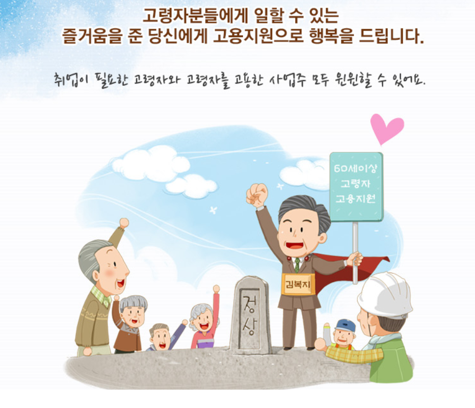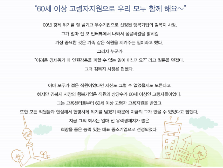 60세 이상 고령자를 고용하여 대상자는 활력있는 노후생활을 보낼 수 있고, 사업주는 안정감 있는 경제활동을 할 수 있습니다.
