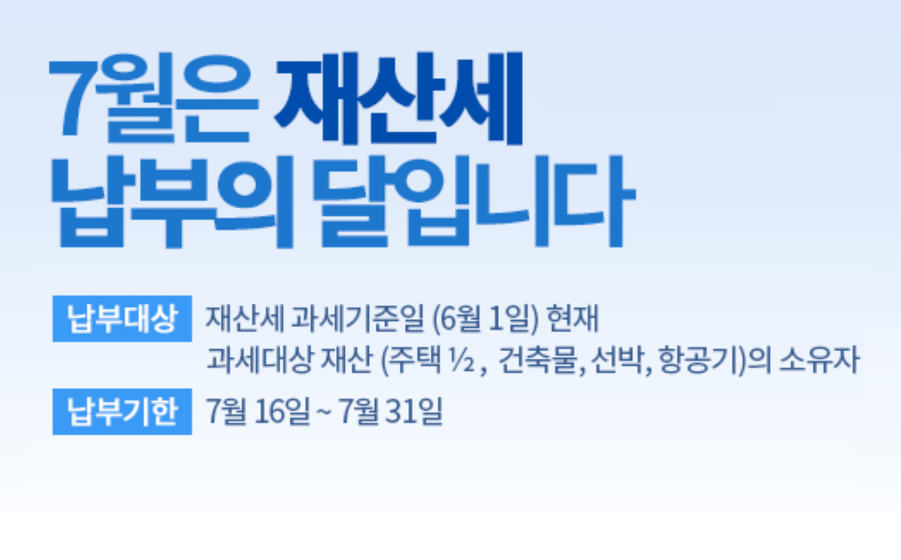 재산세는 과세기준일(6월1일) 기준 소유자를 대상으로 매년 7월과 9월 부과하는데, 7월에는 주택 절반과 건축물, 선박, 항공기가 납부대상이다.